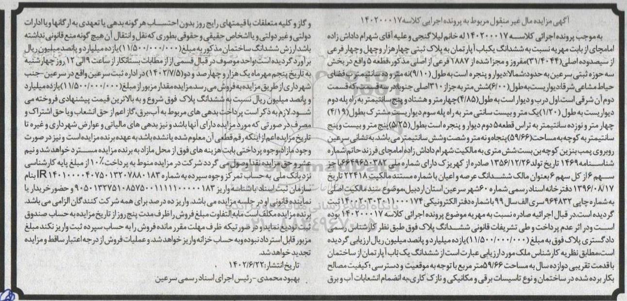 مزایده فروش ششدانگ یک باب آپارتمان به پلاک ثبتی 4044 فرعی از 310 اصلی