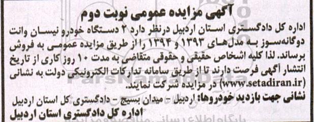 اداره کل دادگستری استان اردبیل در نظر دارد 2 دستگاه خودرو نیسان وانت دوگانه سوز به مدل های 1393 و 1394 را از طریق مزایده عمومی به فروش برساند. لذا کلیه اشخاص حقیقی و حقوقی متقاضی به مدت 10 روز کاری از تاریخ انتشار آگهی فرصت دارند تا از طریق سامانه تدارکات الکترونیکی دولت به نشانی ستاد یاران در مزایده شرکت نمایند.