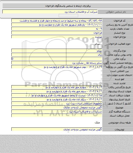 مزایده عمومی مزایده, آگهی مزایده عمومی دو واحد تجاری برگزار میگردد. از کلیه افراد متخصص و شرکتهای واجد شرایط دعوت به عمل میآید تا در این مزایده با کد خبرگزاری پارس نماد : 6347909 شرکت نمایند تاریخ شروع مزایده : 1402/06/22 مهلت شرکت در مزایده: تا پایان روز 1402/06/25 مکان برگزاری اموال واگذاری استانهای یزد و دستهبندیهای مربوط به این حراجی واگذاری ورزشگاه، پارکینگ، غرفه و بوفه میباشد.