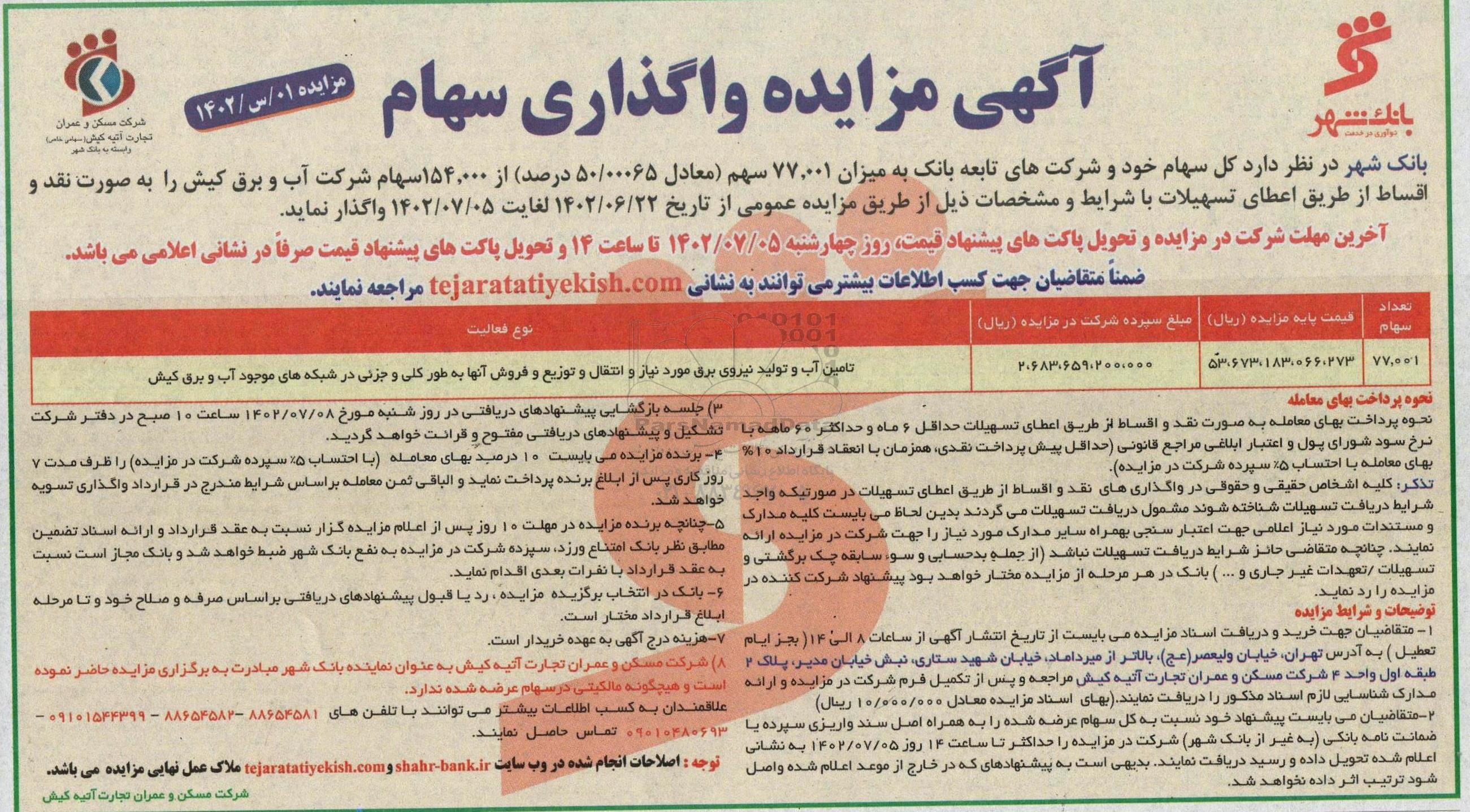 بانک شهر در نظر دارد کل سهام خود و شرکتهای تابعه بانک به میزان ۷۷,۰۰۱ سهم معادل ۵۰.۰۰۰۶۵ درصد از ۱۵۴,۰۰۰ سهام شرکت آب و برق کیش را به صورت نقد و اقساط از طریق اعطای تسهیلات با شرایط و مشخصات ذیل از طریق مزایده عمومی از تاریخ ۱۴۰۲.۰۶.۲۲ لغایت ۱۴۰۲.۰۷.۰۵ واگذار نماید.