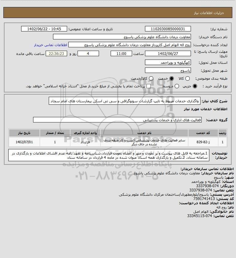 شرح کلی نیاز: واگذاری خدمات مربوط به تایپ گزارشات سونوگرافی و سی تی اسکن بیمارستان های امام سجاد
