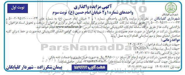 شهرداری گلپایگان در نظر دارد مزایده واگذاری واحدهای شماره 1 و 2 خیابان امام حسین (ع) به شماره 5002095120000034 و 5002095120000033 را از طریق سامانه تدارکات الکترونیکی دولت برگزار نماید.