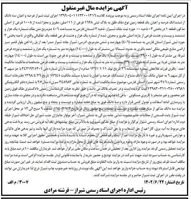 روز مزایده: از ساعت 9 صبح الی 12 مورخ 1402.7.3 در محل اجرای ثبت شیراز