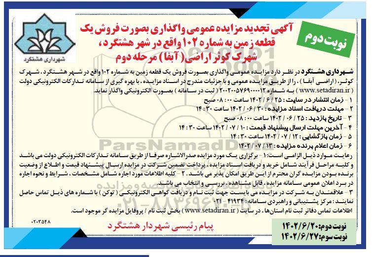 آگهی تجدید مزایده عمومی واگذاری بصورت فروش یک قطعه زمین به شماره 102 واقع در شهر هشتگرد شهرک کوثر (اراضی آبفا) ؟