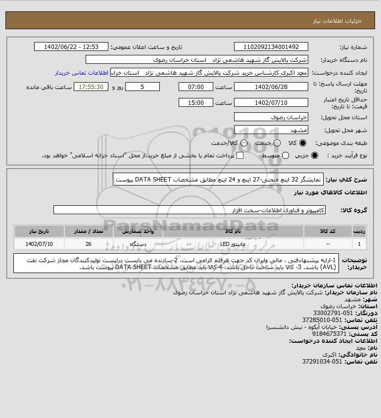 شرح کلی نیاز: نمایشگر 32 اینچ منحنی-27 اینچ و 24 اینچ مطابق مشخصات DATA SHEET پیوست