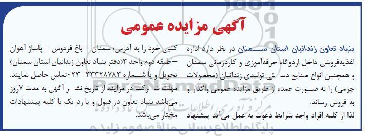 لذا از کلیه افراد واجد شرایط دعوت به عمل می آید پیشنهاد کتبی خود را به آدرس: سمنان ـ باغ فردوس ـ پاساژ آهوان ـ طبقه دوم ـ واحد 3- دفتر بنیاد تعاون زندانیان استان تحویل یا شماره تلفن 33328783-023 تماس حاصل نمایند. مهلت شرکت در مزایده از تاریخ نشر آگهی به مدت 7 روز می باشد. بنیاد تعاون در قبول و یا رد یک یا کلیه پیشنهادات مختار می باشد.