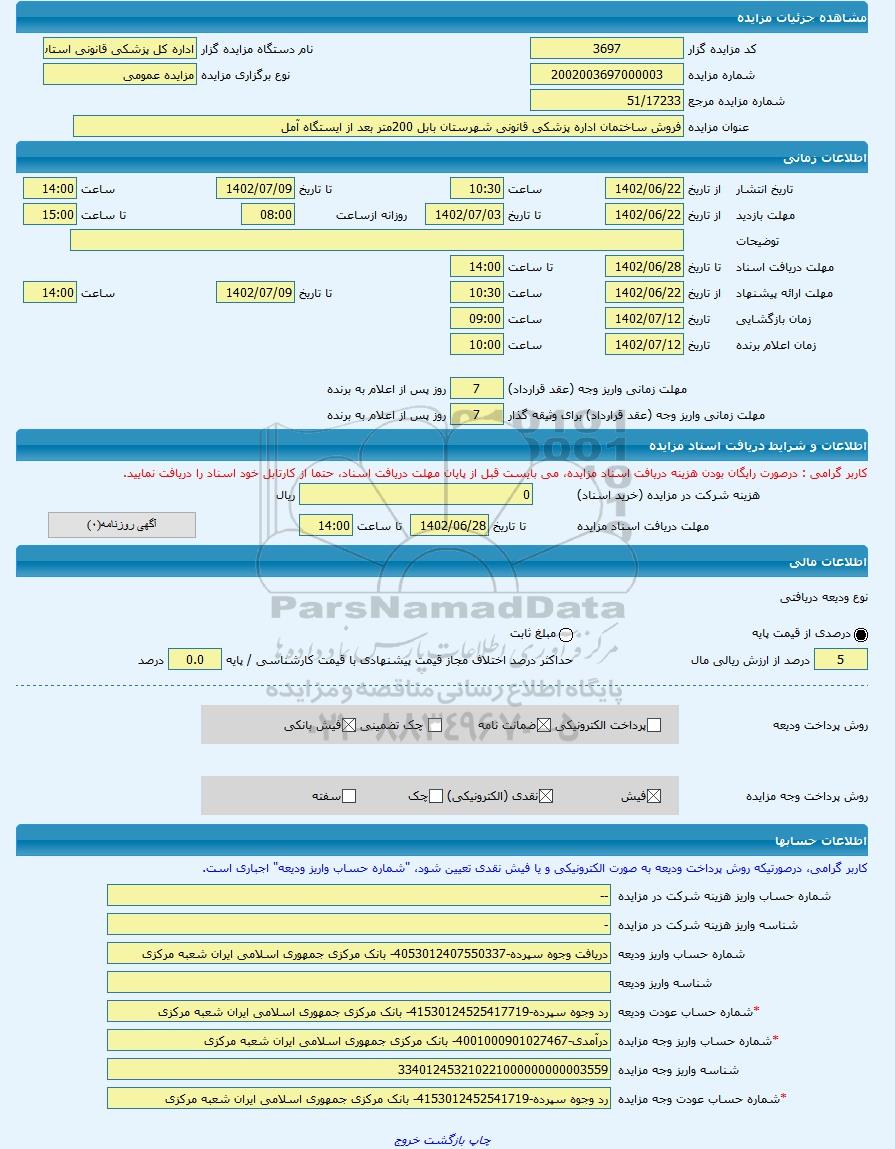 | عنوان مزایده | فروش ساختمان اداره پزشکی قانونی شهرستان بابل 200متر بعد از ایستگاه آمل -مزایده ساختمان - استان مازندران | |||