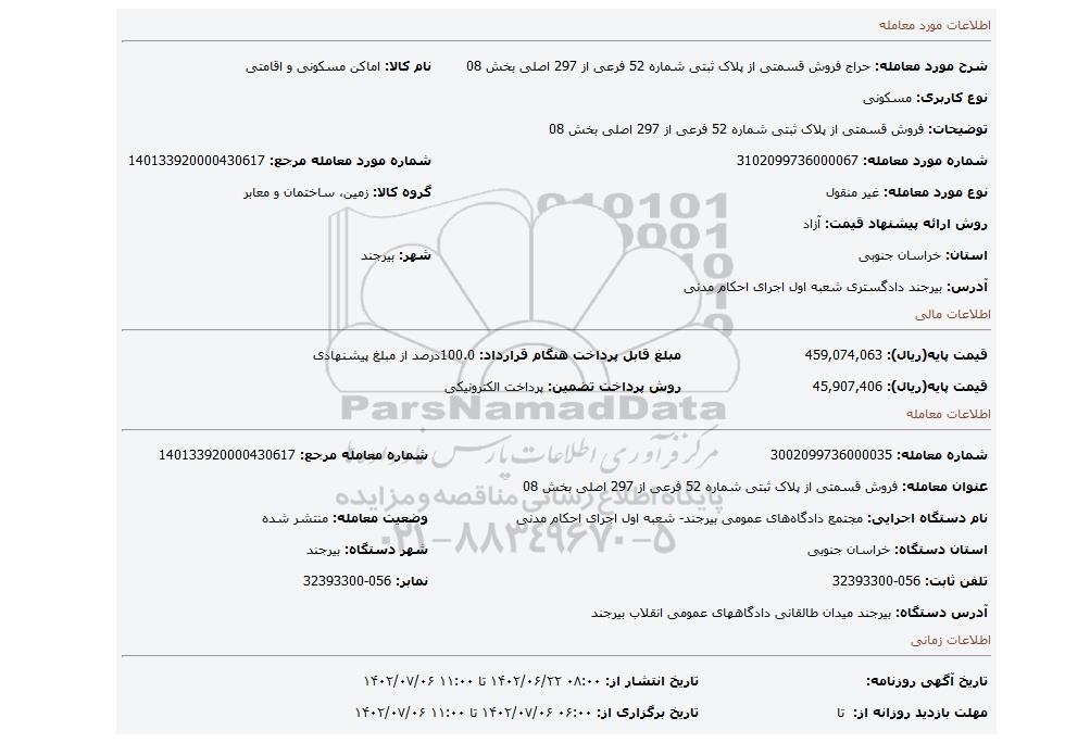| شرح مورد معامله: حراج فروش قسمتی از پلاک ثبتی شماره 52 فرعی از 297 اصلی بخش 08 | نام کالا: اماکن مسکونی و اقامتی | |