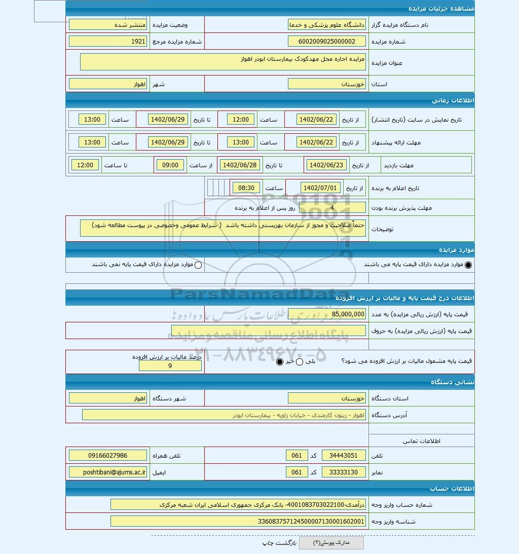| عنوان مزایده | مزایده اجاره محل مهدکودک بیمارستان ابوذر اهواز | |||