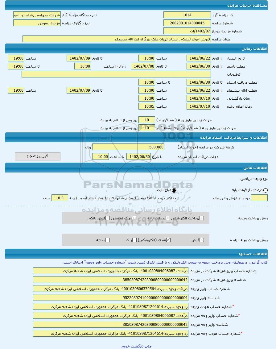 | شماره حساب عودت وجه مزایده | 385039874203900800000000000042 |