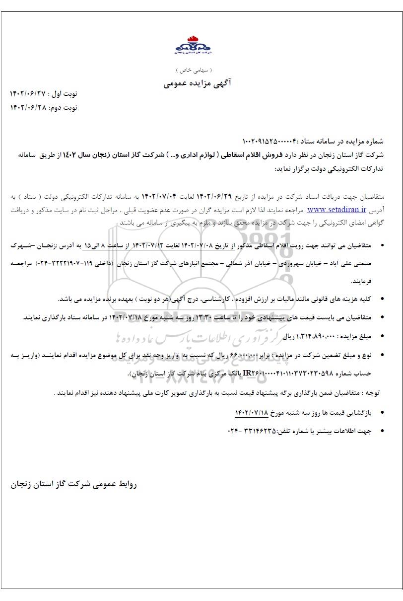 شرکت گاز استان زنجان در نظر دارد فروش اقلام اسقاطی (لوازم اداری و...) شرکت گاز استان زنجان سال 1402 از طریق سامانه تدارکات الکترونیکی دولت برگزار نماید: