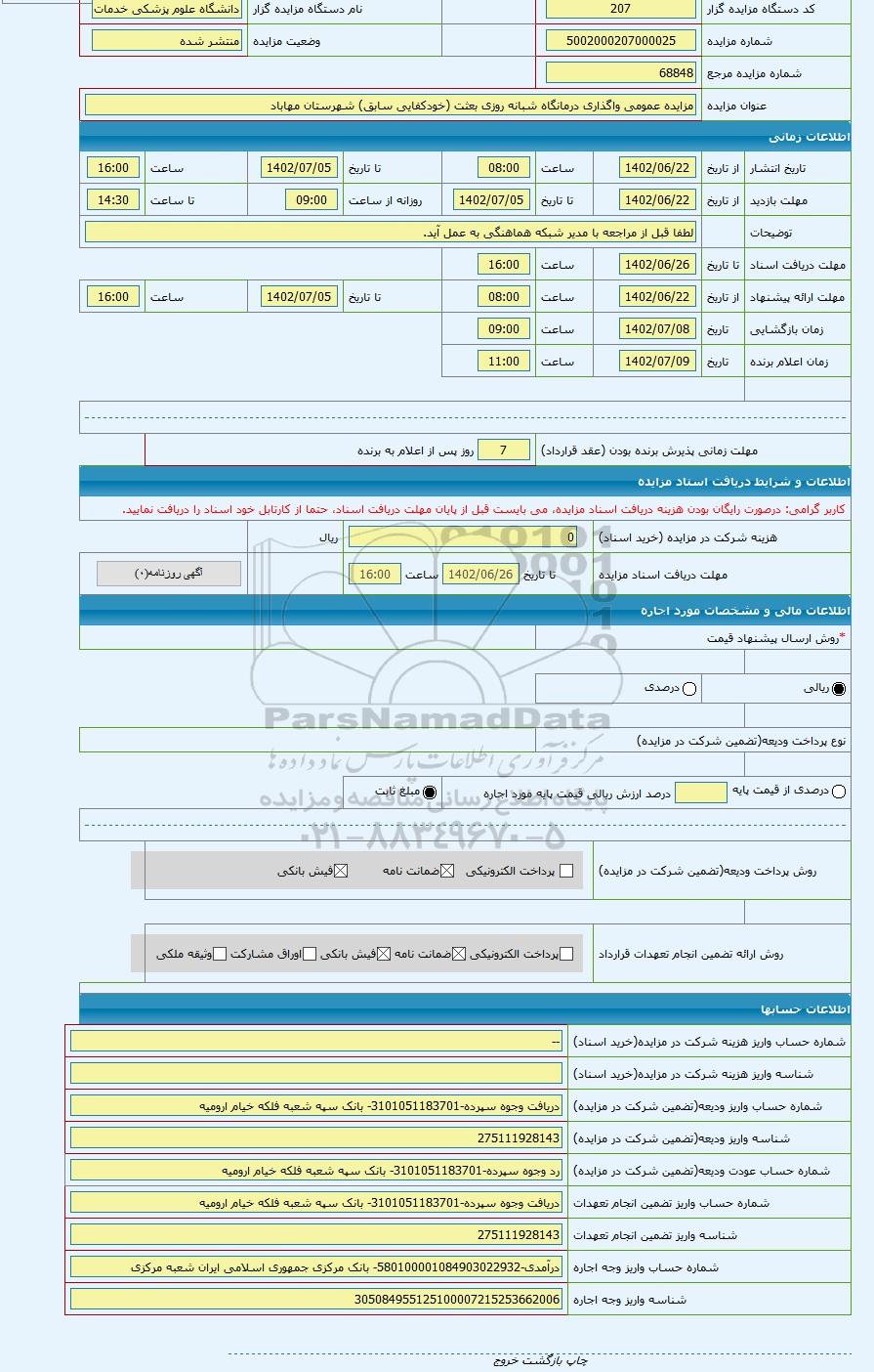 کد مزایده گزار207نام دستگاه مزایده گزاردانشگاه علوم پزشکی خدمات بهداشتی درمانی استان آذربایجان غربی