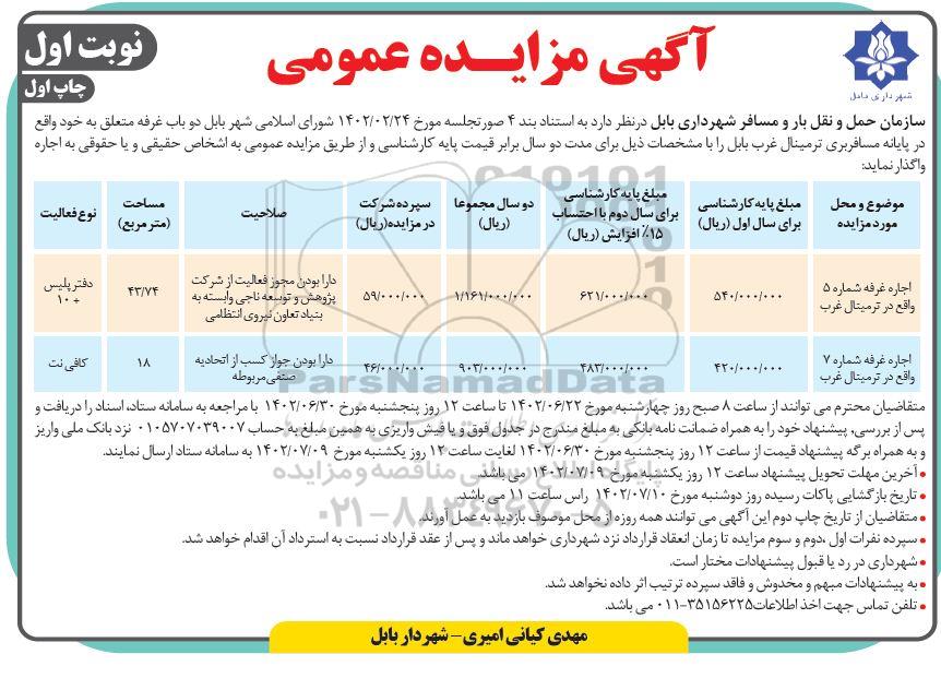 سازمان حمل و نقل بار و مسافر شهرداری بابل در نظر دارد به استناد بند 4 صورتجلسه مورخ 1402.2.24 شورای اسلامی شهر بابل دو باب غرفه متعلق به خود واقع در پایانه مسافری ترمینال غرب بابل را با مشخصات ذیل برای مدت دو سال برابر قیمت پایه کارشناسی و از طریق مزایده عمومی به اشخاص حقیقی و یا حقوقی به اجاره واگذار نماید: