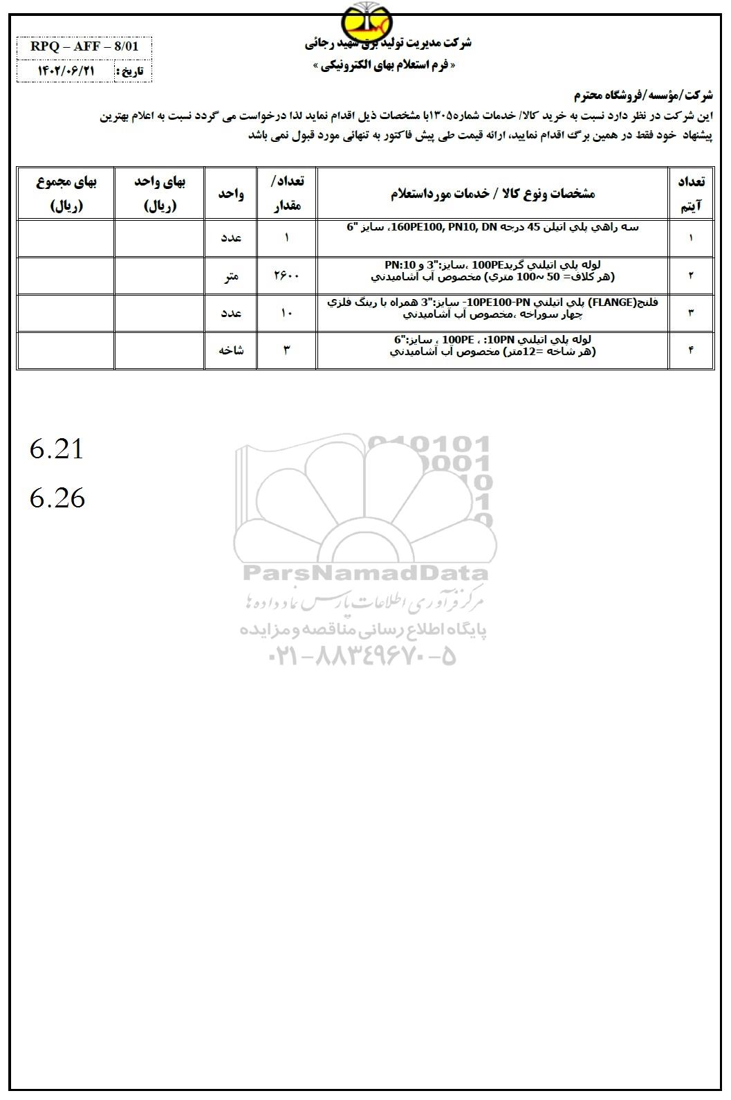 | 1 | سه راهی پلی اتیلن 45 درجه 160pe100 ,pn10 ,dn سایر 6 | 1 | عدد |