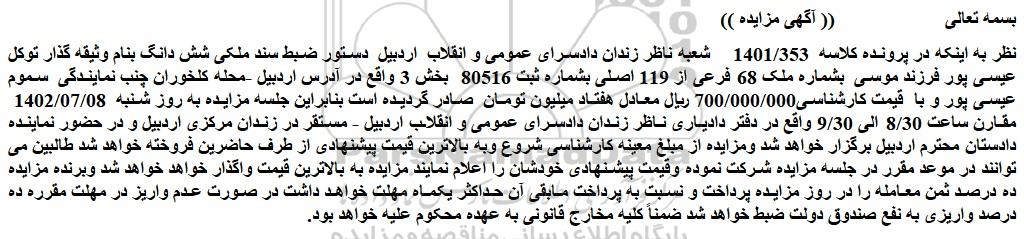 نظر به اینکه در پرونده کلاسه  1401/353    شعبه ناظر زندان دادسرای عمومی و انقلاب  اردبیل  دستور ضبط سند ملکی شش دانگ بنام وثیقه گذار توکل عیسی پور فرزند موسی  بشماره ملک 68 فرعی از 119 اصلی بشماره ثبت 80516  بخش 3 واقع در آدرس اردبیل -محله کلخوران چنب نمایندگی  سموم عیسی پور و با  قیمت کارشناسی700/000/000 ریال معادل هفتاد میلیون تومان  صادر گردیده است بنابراین جلسه مزایده به روز شنبه  1402/07/08  مقارن ساعت 8/30 الی 9/30 واقع در دفتر دادیاری ناظر زندان دادسرای عمومی و انقلاب اردبیل - مستقر در زندان مرکزی اردبیل و در حضور نماینده دادستان محترم اردبیل برگزار خواهد شد ومزایده از مبلغ معینه کارشناسی شروع وبه بالاترین قیمت پیشنهادی از طرف حاضرین فروخته خواهد شد طالبین می توانند در موعد مقرر در جلسه مزایده شرکت نموده وقیمت پیشنهادی خودشان را اعلام نمایند مزایده به بالاترین قیمت واگذار خواهد خواهد شد وبرنده مزایده ده درصد ثمن معامله را در روز مزایده پرداخت و نسبت به پرداخت مابقی آن حداکثر یکماه مهلت خواهد داشت در صورت عدم واریز در مهلت مقرره ده درصد واریزی به نفع صندوق دولت ضبط خواهد شد ضمناً کلیه مخارج قانونی به عهده محکوم علیه خواهد بود.