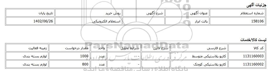 | 158106 | پالت ابزار | استعلام الکترونیکی | 1402/06/26 |