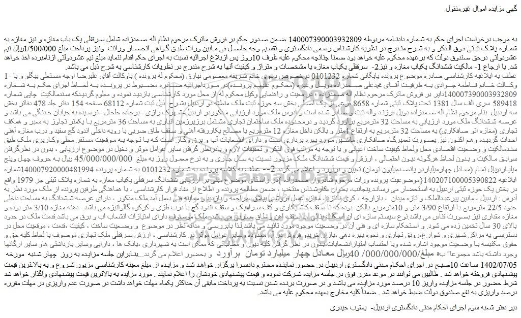 به موجب درخواست اجرای حکم به شماره دادنامه مربوطه 140007390003932809 ضمن صدور حکم بر فروش ماترک مرحوم نظام اله صمدزاده شامل سرقفلی یک باب مغازه و نیز مغازه به شماره پلاک ثبتی فوق الذکر و به شرح مندرج در نظریه کارشناس رسمی دادگستری و تقسیم وجه حاصل فی مابین وراث طبق گواهی انحصار وراثت ونیز پرداخت مبلغ 1/500/000ریال نیم عشردولتی درحق صندوق دولت که برعهده محکوم علیه خواهد بود ضمنا چنانچه محکوم علیه ظرف 10روز پس ازبلاغ اجرائیه نسبت به اجرای حکم اقدام ننماید مبلغ نیم عشردولتی ازنامبرده اخذ خواهد شد. با ارجاع 1- مالکیت ششدانگ یکباب مغازه و نیز2- سرقفلی یکباب مغازه با مشخصات و متراژ و کیفیت آنها به شرح مندرج در نظریات کارشناسی به شرح ذیل می باشد.