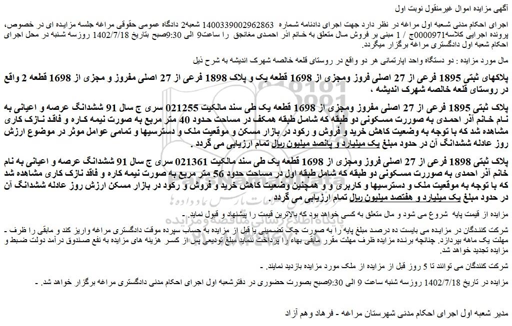 - مزایده در تاریخ 1402/7/18 روزسه شنبه ساعت 9 الی 9:30صبح بصورت حضوری در دفترشعبه اول اجرای احکام مدنی دادگستری مراغه برگزار خواهد شد.