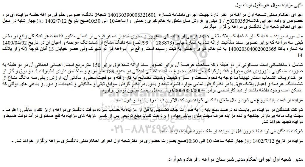 مزایده فروش سه دانگ از ششدانگ پلاک ثبتی 2855 فرعی از 3 اصلی ، مفروز و مجزی شده از صفر فرعی از اصلی ؟