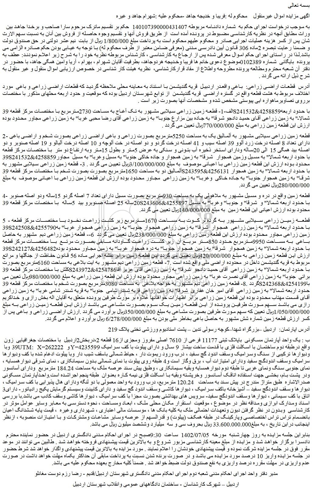 به موجب درخواست اجرای حکم به شماره دادنامه مربوطه 140107390000431407 حکم بر تقسیم ماترک مرحوم سارا صاحب و برخدا جاهد بین وراث مطابق آنچه در نظریه کارشناسی مضبوط در پرونده آمده است از طریق فروش آنها و تقسیم وجوه حاصله از فروش بین آنان به نسبت سهم الارث شان پس از کسر هزینه عملیات اجرایی صادر و محکوم علیهم محکوم است به پرداخت مبلغ 1/800/000 ریال از بابت نیم عشر دولتی در حق صندوق دولت و ضمنا رعایت تبصره 2ماده 306 قانون آیین دادرسی مدنی (معرفی ضامن معتبر از طرف محکوم له) با توجه به غیابی بودن حکم صادره الزامی می باشد.لذا در راستای اجرای حکم اموال معرفی شده پس از ارجاع به کارشناسی ، کارشناس مربوطه نظریه خود را به شرح زیر اعلام نمودند: عطف به پرونده بایگانی شماره 0102389موضوع دعوی خانم ها فریبا وخدیجه هردوجاهد، بطرفیت آقایان شهرام ، بهرام ، آریا وامین همگی جاهد، با حضور در دفتر آن شعبه محترم ومطالعه پرونده مطروحه واطلاع از مفاد قرارکارشناسی، نظریه هیئت کار شناسی در خصوص ارزیابی اموال منقول و غیر منقول به شرح ذیل ارائه می گردد .