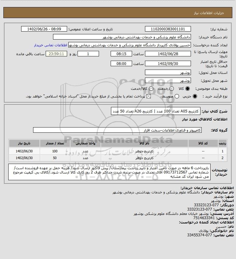 شرح کلی نیاز: کارتریج A05 تعداد 100 عدد | کارتریج A26 تعداد 50 عدد
