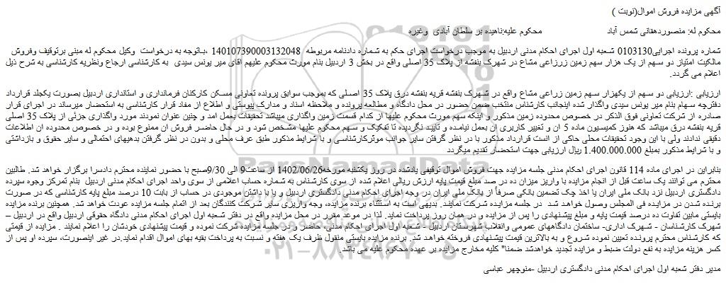 شماره پرونده اجرایی0103130 شعبه اول اجرای احکام مدنی اردبیل به موجب درخواست اجرای حکم به شماره دادنامه مربوطه 140107390003132048 ،باتوجه به درخواست وکیل محکوم له مبنی برتوقیف وفروش مالکیت امتیاز دو سهم از یک هزار سهم زمین زرزاعی مشاع در شهرک بنفشه از پلاک 35 اصلی واقع در بخش 3 اردبیل بنام مورث محکوم علیهم اقای میر یونس سیدی به کارشناسی ارجاع ونظریه کارشناسی به شرح ذیل اعلام می گردد.