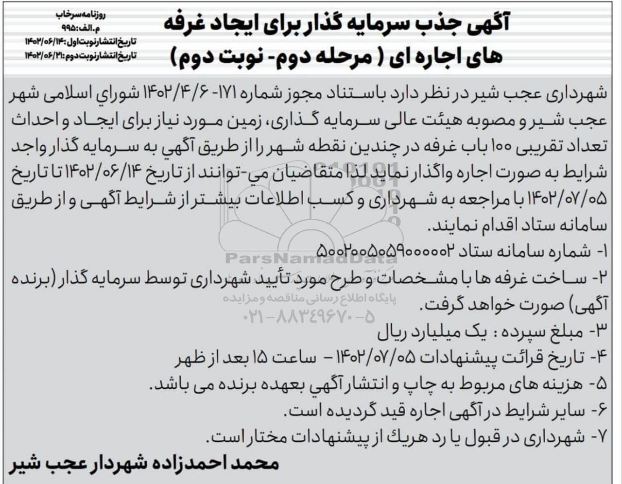 شهرداری عجب شیر در نظر دارد زمین مورد نیاز برای ایجاد و احداث تعداد تقریبی 100 باب غرفه در چندین نقطه شهر را از طریق آگهی به سرمایه گذار واجد شرایط به صورت اجاره واگذار نماید. لذا متقاضیان می توانند از تاریخ 1402.6.14 تا تاریخ 1402.7.5 با مراجعه به شهرداری و کسب اطلاعات بیشستر از شرایط آگهی و از طریق سامانه ستاد اقدام نمایند.