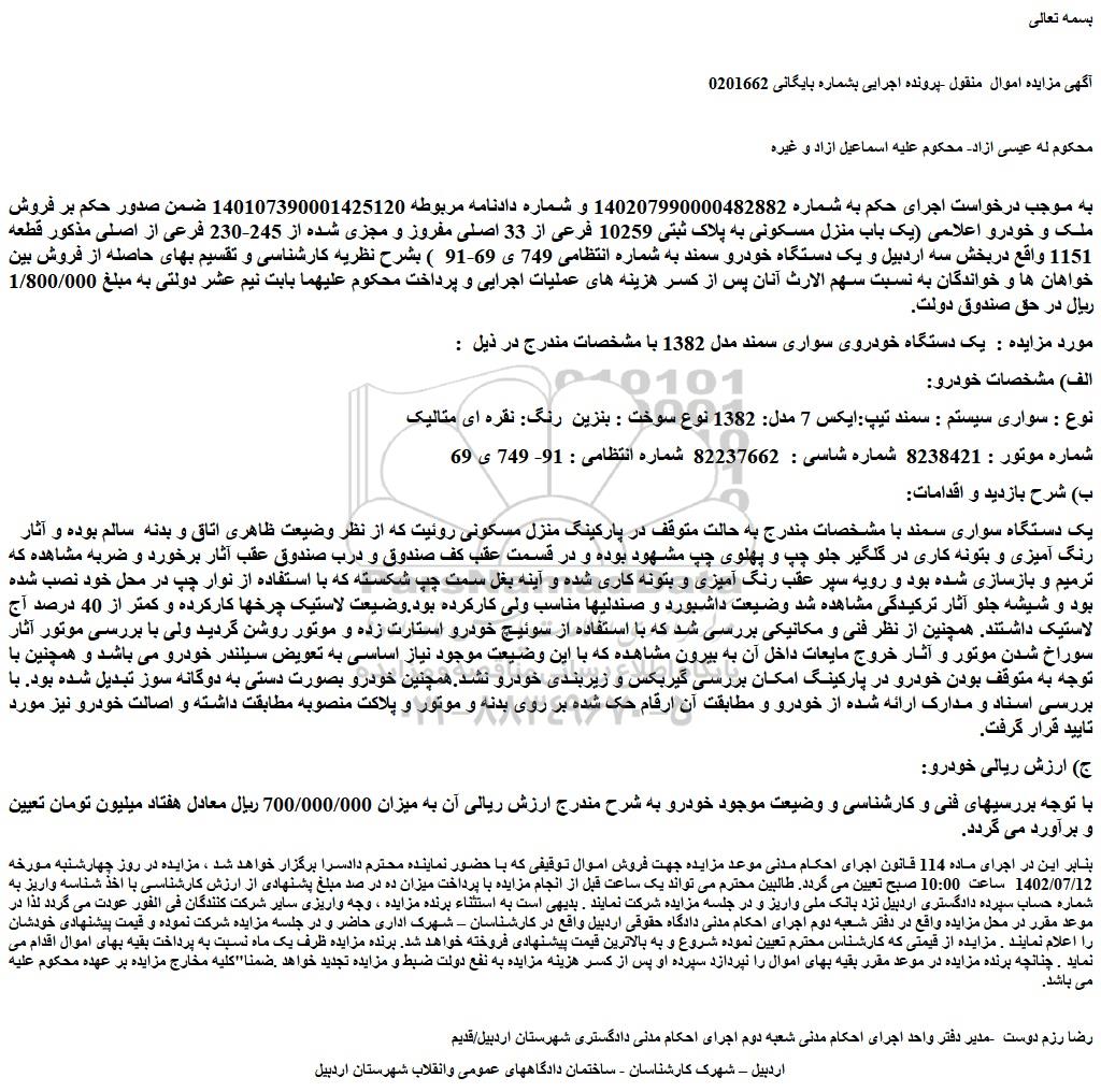 به موجب درخواست اجرای حکم به شماره 140207990000482882 و شماره دادنامه مربوطه 140107390001425120 ضمن صدور حکم بر فروش ملک و خودرو اعلامی (یک باب منزل مسکونی به پلاک ثبتی 10259 فرعی از 33 اصلی مفروز و مجزی شده از 245-230 فرعی از اصلی مذکور قطعه 1151 واقع دربخش سه اردبیل و یک دستگاه خودرو سمند به شماره انتظامی 749 ی 69-91 ) بشرح نظریه کارشناسی و تقسیم بهای حاصله از فروش بین خواهان ها و خواندگان به نسبت سهم الارث آنان پس از کسر هزینه های عملیات اجرایی و پرداخت محکوم علیهما بابت نیم عشر دولتی به مبلغ 1/800/000 ریال در حق صندوق دولت.