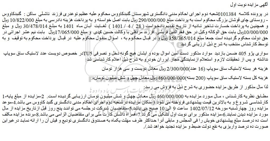 در پرونده کلاسه 0101384شعبه دوم اجرای احکام مدنی دادگستری شهرستان گنبدکاووس محکوم علیه عظیم توغدری فرزند تاشلی ساکن : گنبدکاووس - روستای چای قوشان بزرگ محکوم است به پرداخت مبلغ 290/000/000 ریال بابت اصل خواسته و به پرداخت هزینه دادرسی به مبلغ 10/822/000 ریال و همچنین به پرداخت خسارت تاخیر تادیه از تاریخ تقدیم دادخواست ( 28 / 4 / 1401 ) لغایت آبان ماه 1401 به مبلغ 30/478/014 ریال و مبلغ 10/000/000ریال بابت حق الوکاله وکیل در حق فخرالدین قریشی فرزند مردقلی با وکالت حسین محمدی و مبلغ 17/065/000ریال بابت نیم عشر اجرائی در حق دولت محکوم گردیده است جمعا مبلغ 358/365/014 ریال و در قبال محکوم به ، اموال منقول محکوم علیه در قبال پرداخت محکوم به توقیف و به توسط کارشناس منتخب به شرح ذیل ارزیابی گردید: