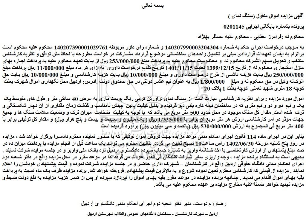 به موجب درخواست اجرای حکم به شماره 140207990003204304 و شماره رای داور مربوطه 140207390001029761 محکوم علیه محکوم است برالزام به ایفای تعهدات قراردادی مبنی بر تکمیل واحدهای ساختمانی موضوع قرارداد مشارکت در خواست مطروحه با لحاظ متن توافق و نظریه کارشناس منتخب و تحویل سهم الشرکه محکوم له و محکومیت محکوم علیه به پرداخت مبلغ 253/000/000 ریال از بابت تعهد محکوم علیه به پرداخت اجاره بهای منزل استیجاری محکوم له از تاریخ 1399/12/15 لغایت 1401/11/15 تاریخ تقدیم درخواست داوری به ازای هر ماه مبلغ 11/000/000 ریال پرداخت مبلغ 250/000/000 ریال بابت هزینه ناشی از طرح درخواست داوری و مبلغ 10/000/000 ریال بابت هزینه کارشناسی و مبلغ 10/000/000 ریال بابت حق الوکاله وکیل در حق محکوم له و مبلغ 1/800/000 ریال به عنوان نیم عشر دولتی در حق صندوق دولت .آدرس: اردبیل محل نگهداری اموال شهرک بعثت کوچه 18 متری شهید نعمتی کوچه بعثت 1 پلاک 20