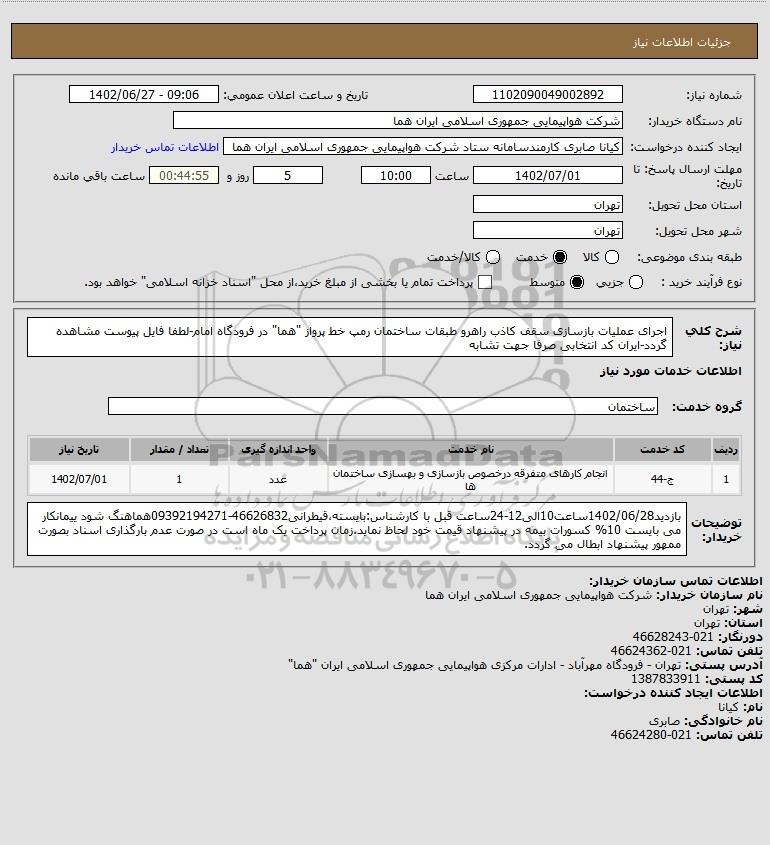 شرح کلی نیاز: اجرای عملیات بازسازی سقف کاذب راهرو طبقات ساختمان رمپ خط پرواز "هما" در فرودگاه امام-لطفا فایل پیوست مشاهده گردد-ایران کد انتخابی صرفا جهت تشابه