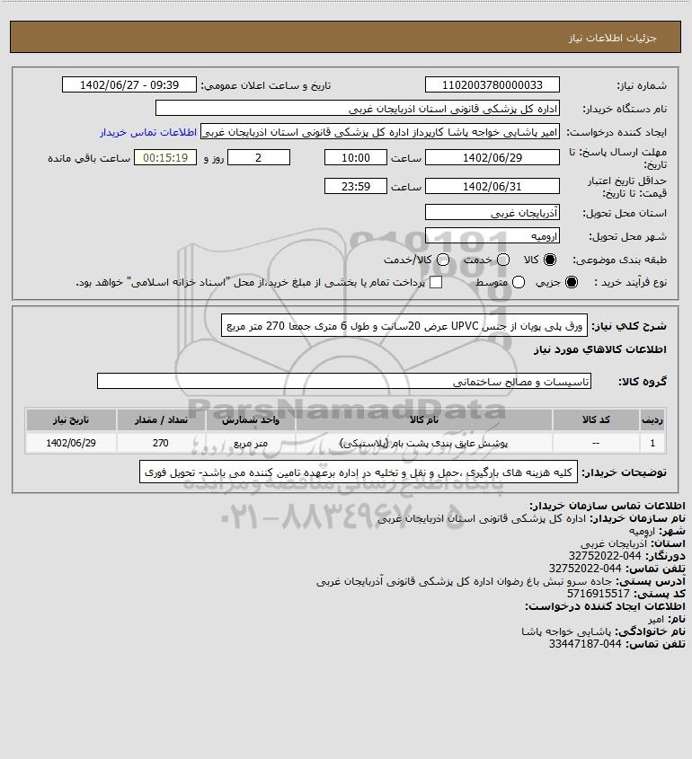 شرح کلی نیاز: ورق پلی پویان از جنس UPVC عرض 20سانت و طول 6 متری جمعا 270 متر مربع