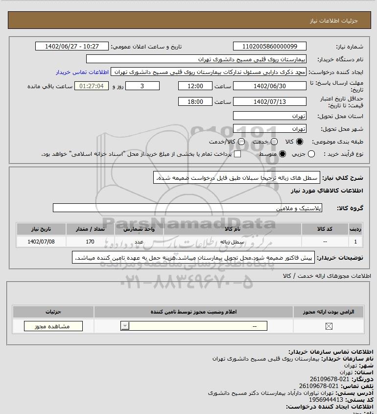 توضیحات خریدار:پیش فاکتور ضمیمه شود.محل تحویل بیمارستان میباشد.هزینه حمل به عهده تامین کننده میباشد.
