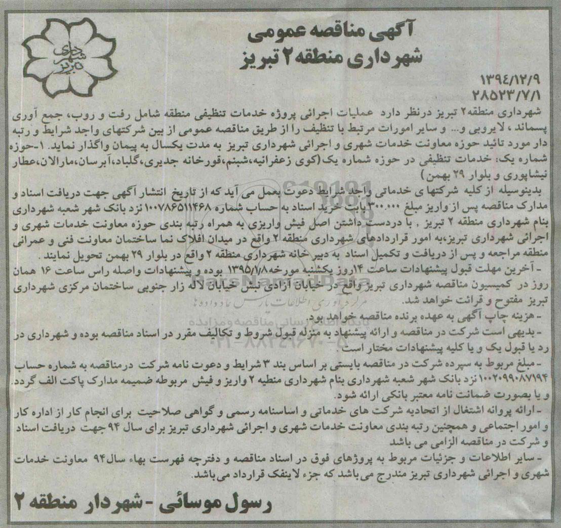 شهرداری منطقه دو تبریز در نظر دارد عملیات اجرائی پروژه خدمات تنظیفی منطقه شامل رفت و روب و جمع آوری پسماند و لایروبی و.. سایر امورات مرتبط با تنظیف را از طریق مناقصه عمومی از بین شرکتهای واجد شرایط و رتبه دار مورد تایید حوزه معاونت خدمات شهری و اجرایی شهرداری تبریز به مدت یک سال به پیمان واگذار نماید.
