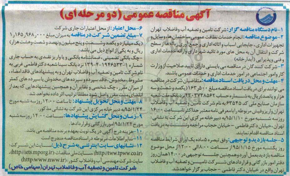 3. مهلت و محل دریافت اسناد مناقصه: متقاضیان شرکت در مناقصه می توانند برای دریافت اسناد مناقصه مبلغ 163.500 یکصد و شصت و سه هزار و پانصد ریال به شماره حساب 4303738562 نزد بانک ملت شعبه سازمان صنایع ملی کد 63545 بنام شرکت تامین و تصفیه آب و فاضلاب تهران واریز و فیش مربوطه را با معرفی نامه معتبر حداکثر تا ساعت 16 روز 3شنبه مورخ 95.1.10 به دبیرخانه مرکزی این شرکت به نشانی : تهران، خیابان دکتر فاطمی، خیابان حجاب، مراجعه و نسبت به دریافت اسناد مناقصه اقدام نمایند