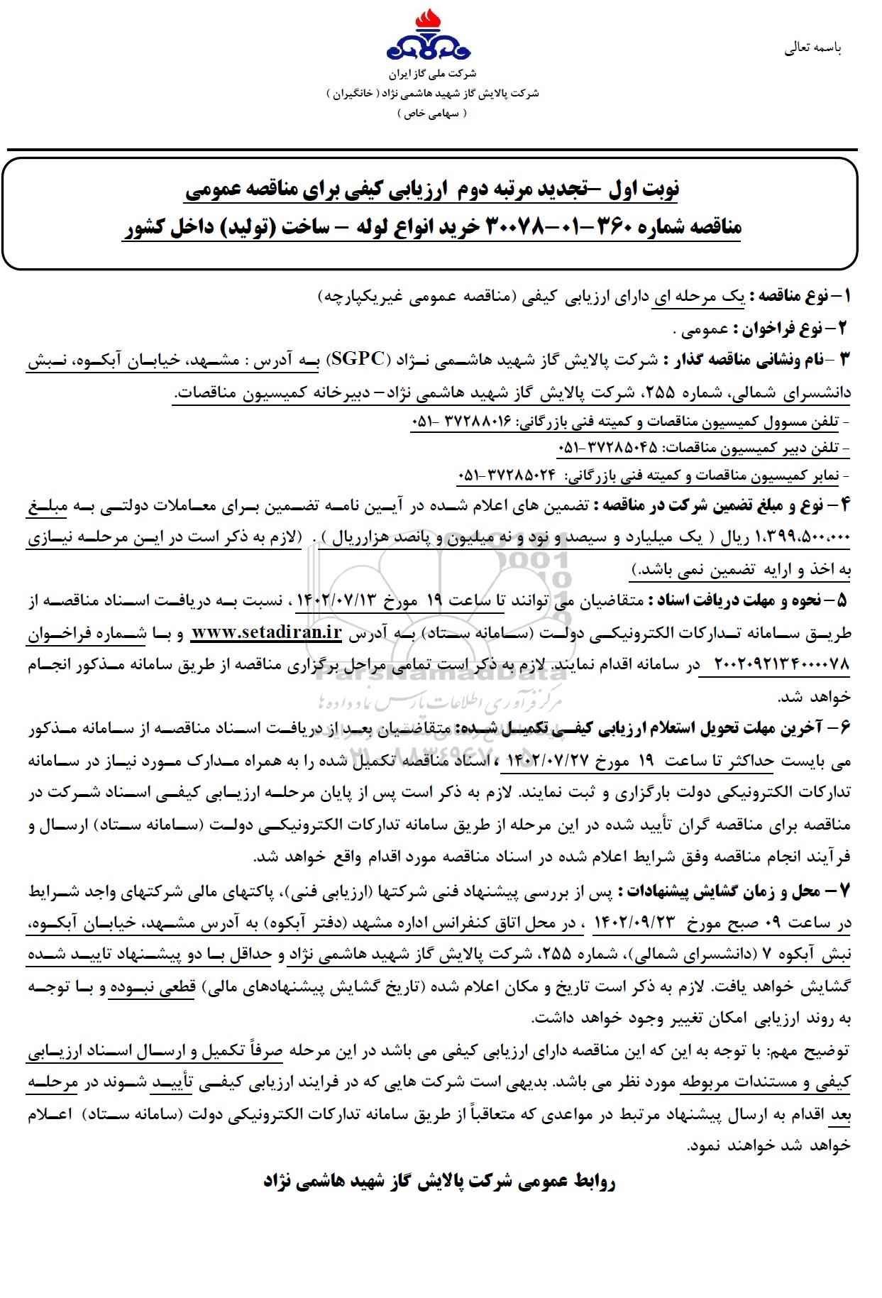 3- نام و نشانی مناقصه گذار: شرکت پالایش گاز شهید هاشمی نژاد SGPC به آدرس مشهد، خیابان آبکوه، نبش دانشسرای شمالی، شماره 255 شرکت پالایش گاز شهید هاشمی نژاد دبیرخانه کمیسیون مناقصات