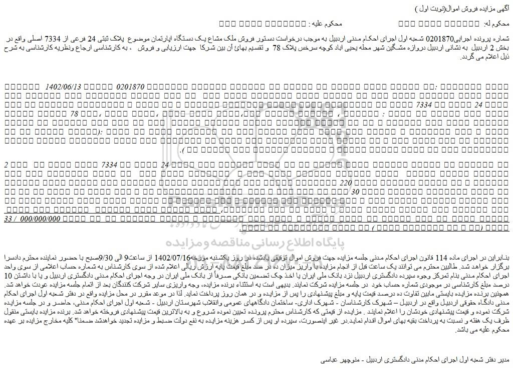 متن آگهی: آگهی مزایده فروش اموال(نوبت اول ) محکوم له:  حسنعلی لطفی آذر                            محکوم علیه : رحیمعلی لطفی آذر  شماره پرونده اجرایی0201870 شعبه اول اجرای احکام مدنی اردبیل به موجب درخواست دستور فروش ملک مشاع یک دستگاه اپارتمان موضوع  پلاک ثبتی 24 فرعی از 7334 اصلی واقع در بخش 2 اردبیل  به نشانی اردبیل دروازه مشگین شهر محله یحیی اباد کوچه سرخس پلاک 78  و تقسیم بهائ آن بین شرکا  جهت ارزیابی و فروش   ، به کارشناسی ارجاع ونظریه کارشناسی به شرح ذیل اعلام می گردد. مورد ارزیابی :در اجرای قرار صادره در رابطه با پرونده بشماره بایگانی 0201870 مورخه 1402/06/13  درخصوص دعوی آقای حسنعلی لطفی آذر به طرفیت آقای رحیمعلی لطفی آذر  در این رابطه ارزیابی ملک بشماره پلاک ثبتی 24 فرعی از 7334 اصلی با حضوردرآن شعبه محترم ومطالعه پرونده و در معیت و راهنمائی خواهان به محل وقوع پلاک مذکور به آدرس : اردبیل ، دروازه مشگین شهر،محله یحیی آباد ،کوچه سرخس ،پلاک 78 عزیمت نموده وازمحل وقوع ملک بازدید و پس از بررسی وتطبیق مدارک مالکیت ارائه  شده با محل وبا مراجعه به سوابق ثبتی و طبق تحقیقات و بررسی های بعمل آمده مراتب ذیل به استحضار اعلام می گردد :(توضیح اینکه پس از مراجعه به محل وقوع ملک و دق الباب مورد ارزیابی کسی نسبت به بازکردن درب مورد ارزیابی اقدام ننمود وارزیابی ملک بر اساس وضعیت ظاهری و موقعیت بیرونی ملک انجام شد ). با مراجعه به سوابق پرونده ثبتی معلوم شد که عرصه واعیان پلاک ثبتی 24 فرعی از 7334 اصلی واقع در  بخش 2 اردبیل بصورت مشاعی  بنام آقایان حسنعلی لطفی آذر و  رحیمعلی لطفی آذر  با حدود ومشخصات طبق سند مالکیت و به مساحت ششدانگ عرصه 220 مترمربع منظور شده ودر وضعیت موجود ششدانگ پلاک بصورت خانه مسکونی که سازه ساختمان باقدمت بالای 30 سال از نوع آجر و آهن  ودارای انشعابات آب و برق وگاز می باشد که با در نظر گرفتن موقعیت مکانی ملک و نوع اعیانی های احداثی و راه دسترسی به معابر اصلی وعرف خریدو فروش به نرخ عادلانه روز وسایر جوانب موثر و دخیل در امر ارزیابی، ارزش ریالی عرصه واعیان  ششدانگ پلاک ثبتی  مذکور بدون در نظر گرفتن هر گونه عوارض و بدهی های احتمالی و مقدار تعریضی آن به مبلغ 000/000/000 / 33 ریال (سی و سه میلیارد ریال ) بر آورد وارزیابی می گردد. بنابراین در اجرای ماده 114 قانون اجرای احکام مدنی جلسه مزایده جهت فروش اموال توقیفی یادشده در روز یکشنبه مورخه1402/07/16 از ساعت9 الی 9/30صبح با حضور نماینده محترم دادسرا برگزار خواهد شد. طالبین محترم می توانند یک ساعت قبل از انجام مزایده با واریز میزان ده در صد مبلغ قیمت پایه ارزش ریالی اعلام شده از سوی کارشناس به شماره حساب اعلامی از سوی واحد اجرای احکام مدنی بنام تمرکز وجوه سپرده دادگستری اردبیل نزد بانک ملی ایران یا اخذ چک تضمین بانکی صرفاً از بانک ملی ایران در وجه اجرای احکام مدنی دادگستری اردبیل و یا با داشتن 10 درصد مبلغ کارشناسی در موجودی شماره حساب خود  در جلسه مزایده شرکت نمایند. بدیهی است به استثناء برنده مزایده، وجه واریزی سایر شرکت کنندگان بعد از اتمام جلسه مزایده عودت خواهد شد. همچنین برنده مزایده بایستی مابین تفاوت ده درصد قیمت پایه و مبلغ پیشنهادی را پس از مزایده و در همان روز پرداخت نماید. لذا در موعد مقرر در محل مزایده واقع در دفتر شعبه اول اجرای احکام مدنی دادگاه حقوقی اردبیل واقع در اردبیل – شهرک کارشناسان - شهرک اداری- ساختمان دادگاههای عمومی وانقلاب شهرستان اردبیل - شعبه اول اجرای احکام مدنی، حاضر و در جلسه مزایده شرکت نموده و قیمت پیشنهادی خودشان را اعلام نمایند . مزایده از قیمتی که کارشناس محترم پرونده تعیین نموده شروع و به بالاترین قیمت پیشنهادی فروخته خواهد شد. برنده مزایده بایستی منقول ظرف یک هفته و نسبت به پرداخت بقیه بهای اموال اقدام نماید.در غیر اینصورت، سپرده او پس از کسر هزینه مزایده به نفع دولت ضبط و مزایده تجدید خواهدشد ضمنا" کلیه مخارج مزایده بر عهده محکوم 