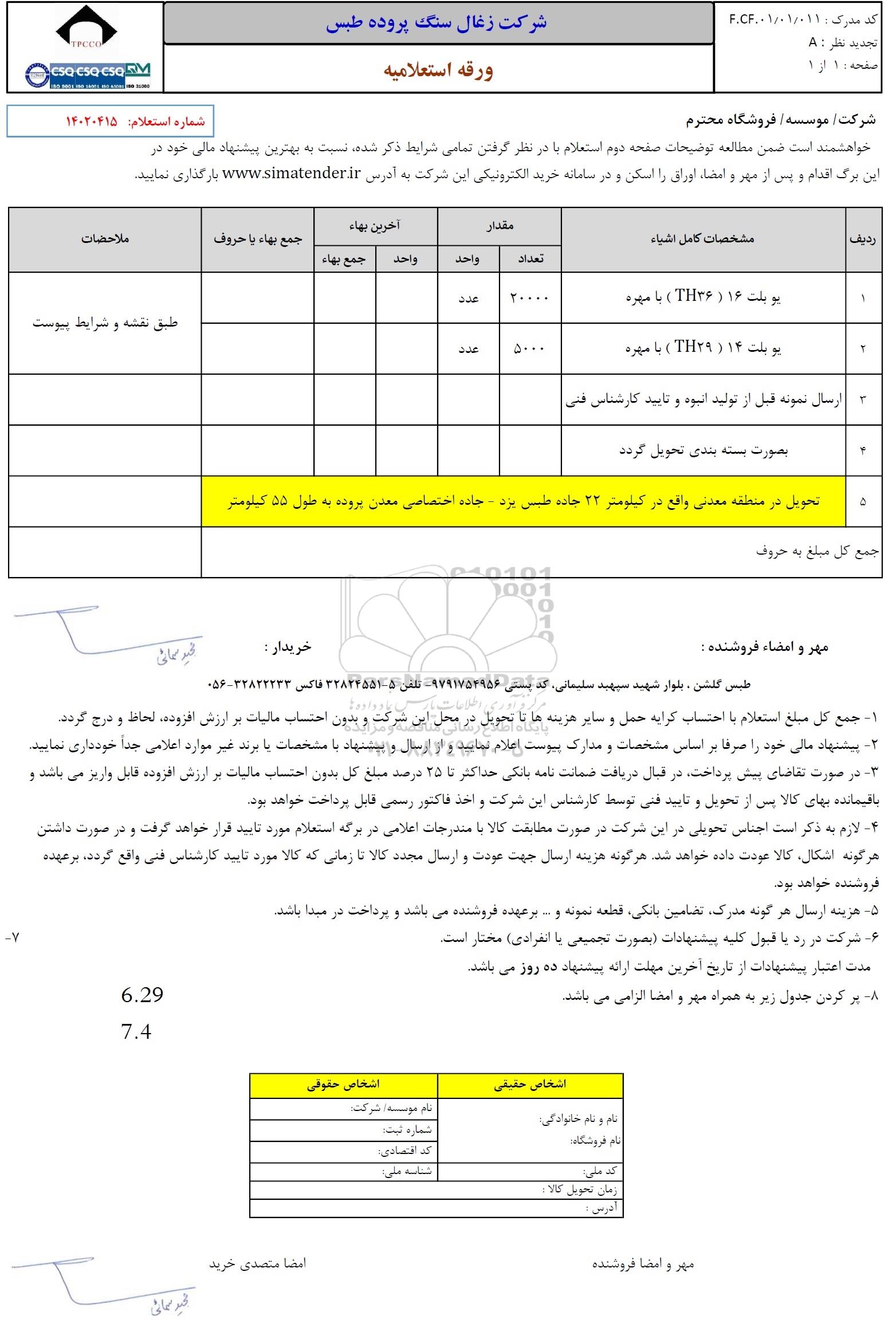 | 1 | یو بلت 16 (TH36) با مهره | 20000 | عدد | طبق نقشه و شرایط پیوست | |||