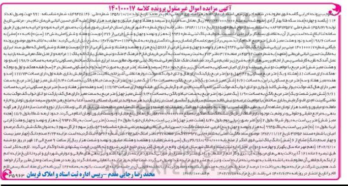 روز مزایده: 2شنبه 1402.7.10 از ساعت 9 الی 12 ظهر در محل اداره ثبت اسناد و املاک شهرستان فریمان