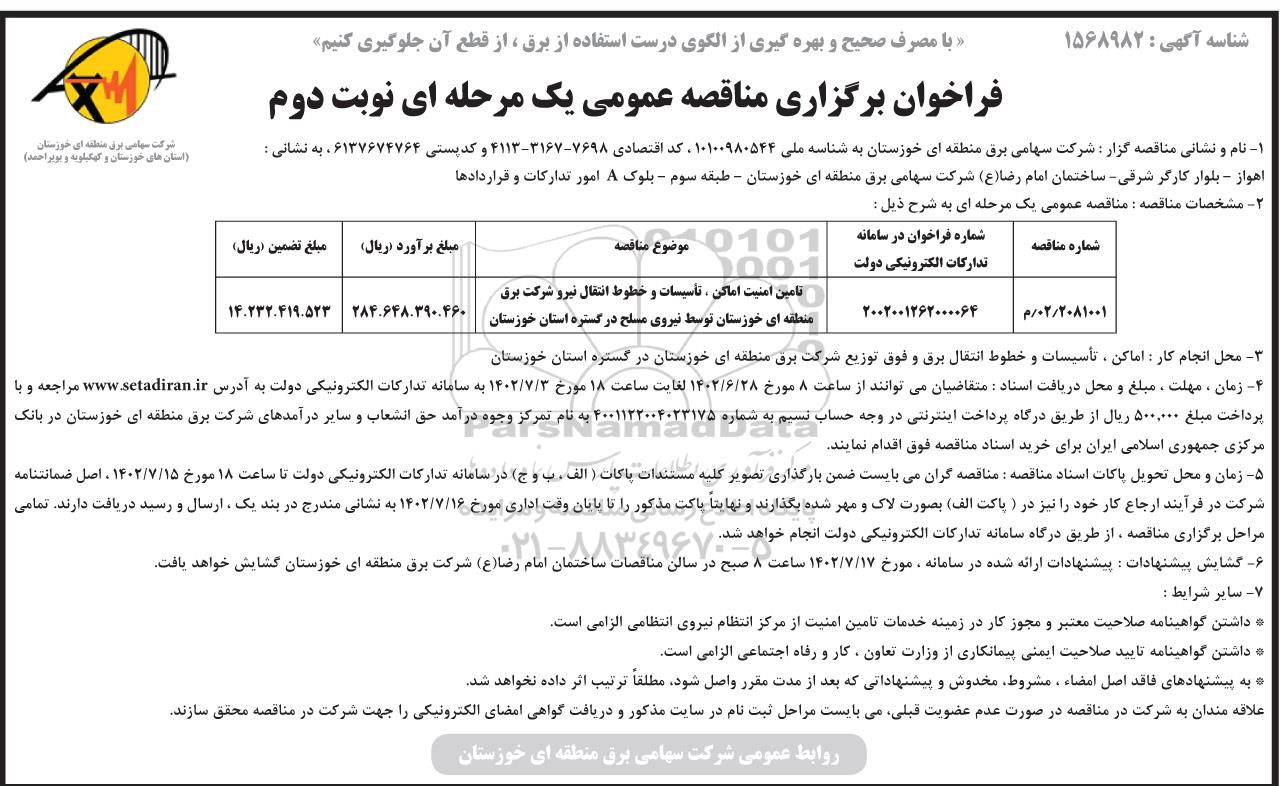 | 02/2081001/م | 2002001262000064 | تامین امنیت اماکن ، تاسیسات و خطوط انتقال نیرو شرکت برق منطقه ای خوزستان توسط نیروی مسلح در گستره استان خوزستان | 284.648.390.460 | 14.232.419.523 |
