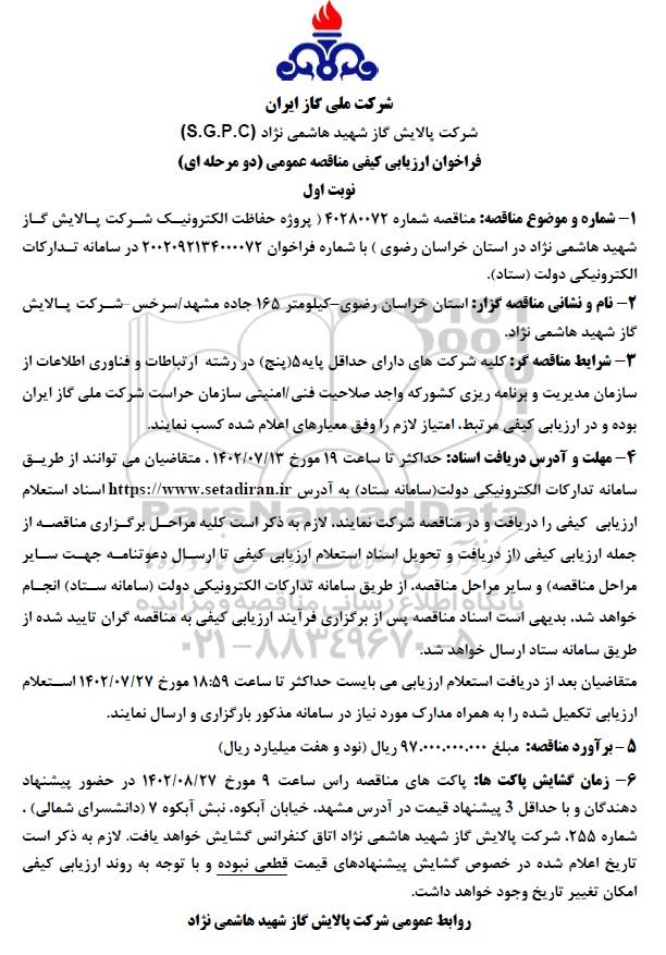 1.شماره و موضوع مناقصه : مناقصه  شماره 40280072 (پروژه حفاظت الکترونیک شرکت پالایش گاز شهید هاشمی نژاد در استان خراسان رضوی)