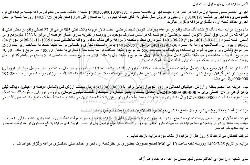 - مزایده در تاریخ 1402/7/25 روزسه شنبه ساعت 10 الی 10:30صبح بصورت حضوری در دفترشعبه اول اجرای احکام مدنی دادگستری مراغه برگزار خواهد شد.