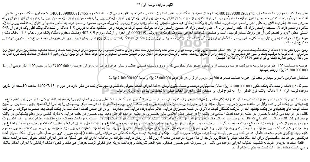 نظر به اینکه  به موجب دادنامه شماره 140013390001863841صادره از شعبه 7 دادگاه تجدید نظر استان یزد که در مقام تجدید نظر خواهی از دادنامه شماره 140013390000717455  شعبه اول دادگاه عمومی حقوقی تفت صادر گردیده است در خصوص دعوی اولیه خانم نرگس راسخی نژاد که پس از فوت ایشان آقایان 1- حسین پورتراب 2- محمد پور تراب 3-علی پور تراب 4- حسن پورتراب 5- محسن پور تراب فرزندان قنبر بعنوان ورثه معرفی شده اند بطرفیت آقای 1- علی اکبر راسخی نژاد فرزند استاد باقر با وکالت 1-آقای محمد حسین سلیمیان 2- خانم زینب زارع زردینی 2- ورثه مرحوم محمود راسخی نژاد به اسامی خانمها و آقایان 1- فاطمه پورتراب 2- طاهره راسخی نژاد 3- صدیقه راسخی نژاد 4- طیبه راسخی نژاد 5- علی راسخی نژاد 6- حسین راسخی نژاد به خواسته تقسیم ترکه مرحومه زهرا سلطانیه حکم به فروش 1.5 دانگ از ششدانگ پلاک ثبتی یک فرعی از 963 اصلی بخش 7یزد و تقسیم ثمن آن بین وراث صادرگردیده است و مطابق اقدامات اجرایی صورت گرفته در پرونده 0000459 این اجرا و ارشاد مورخ 402.3.9 ریاست محترم دادگاه پلاک مورد حکم 1.5  دانگ مشاع موضوع دادخواست بشرح ذیل توسط کارشناس رسمی دادگستری ارزیابی گردیده است :  « در خصوص ارزیابی 1.5 دانگ از  ششدانگ پلاک 1 فرعی از 963 اصلی  بخش 7 یزد  ، روستای طزرجان ، محله سرباغ شاه ،  مشروح کارشناسی به شرح ذیل میباشد .