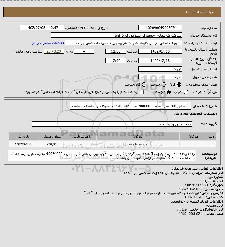 نام دستگاه خریدار:شرکت هواپیمایی جمهوری اسلامی ایران هما