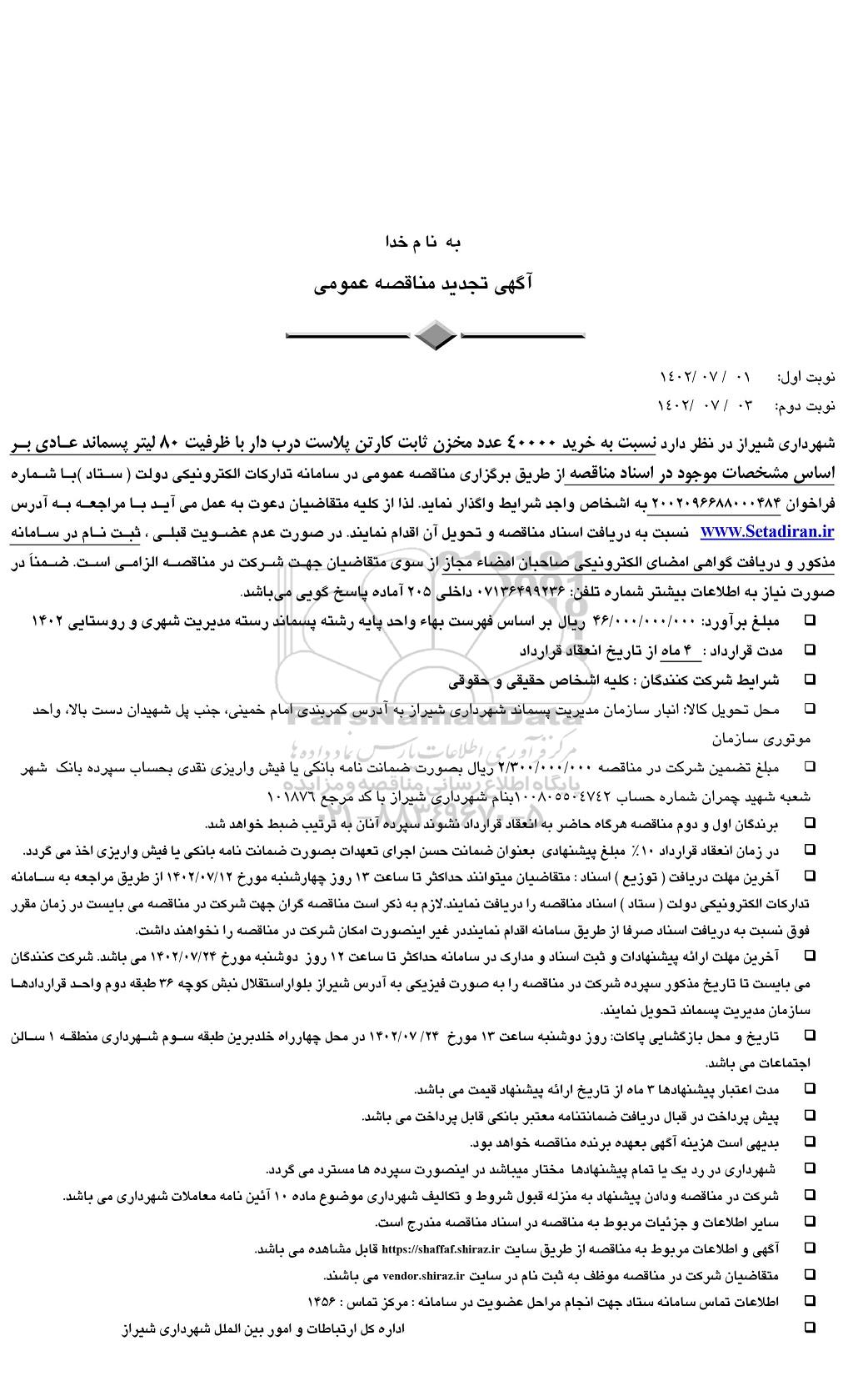 شهرداری شیراز در نظر دارد نسبت به خرید 40000 عدد مخزن ثابت کارتن پلاست درب دار با ظرفیت 80 لیتر پسماند عادی بر اساس مشخصات موجود در اسناد مناقصه از طریق برگزاری مناقصه عمومی در سامانه تدارکات الکترونیکی دولت (ستاد) با شماره فراخوان 2002096688000484 به اشخاص واجد شرایط واگذار نماید. لذا از کلیه متقاضیان دعوت به عمل می آید با مراجعه به آدرس ستاد ایران نسبت به دریافت اسناد مناقصه و تحویل آن اقدام نمایند. در صورت عدم عضویت قبلی، ثبت نام در سامانه مذکور و دریافت گواهی امضای الکترونیکی صاحبان امضاء مجاز از سوی متقاضیان جهت شرکت در مناقصه الزامی است. ضمناً در صورت نیاز به اطلاعات بیشتر شماره تلفن: 07136499236 داخلی 205 آماده پاسخ گویی می باشد.