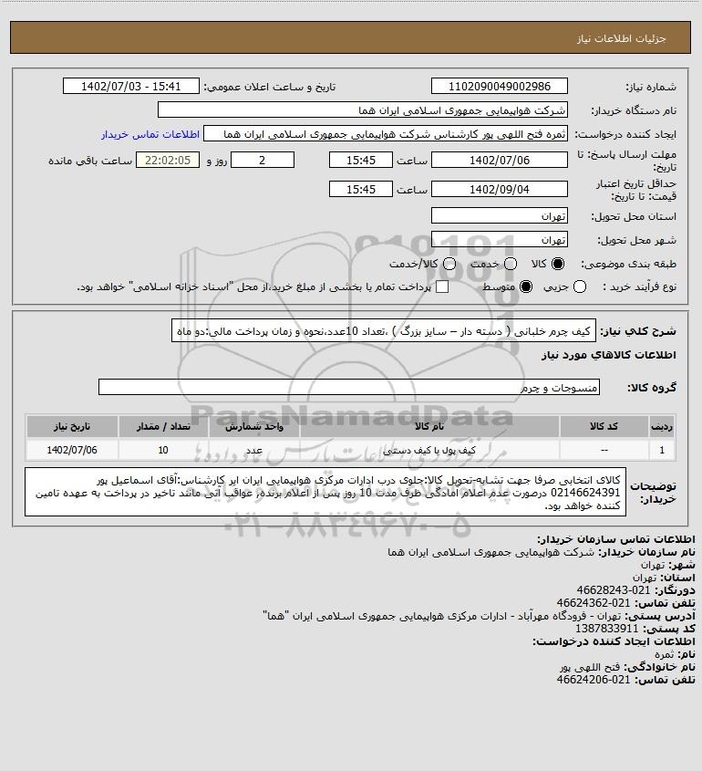 شرح کلی نیاز: کیف چرم خلبانی ( دسته دار – سایز بزرگ ) ،تعداد 10عدد،نحوه و زمان پرداخت مالی:دو ماه