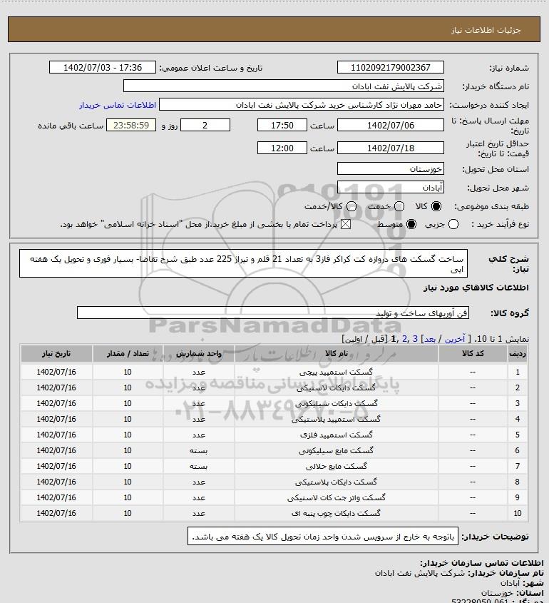 | 8 | -- | گسکت دایکات پلاستیکی | عدد | 10 | 1402/07/16 |