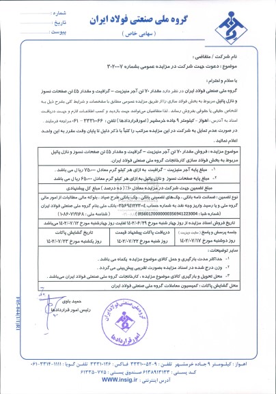 گروه ملی صنعتی فولاد ایران در نظر دارد مقدار 70 تن آجر منیزیت - گرافیت و مقدار 45 تن صفحات نسوز و نازل پاتیل مربوط به بخش فولادسازی را از طریق مزایده عمومی مطابق با مشخصات و شرایط کلی بشرح ذیل به اشخاص حقیقی یا حقوقی بفروش رساند. لذا کلیه متقاضیان می توانند جهت بازدید و کسب اطلاعات لازم و جهت دریافت اسناد به آدرس: اهواز - کیلومتر 9 جاده خرمشهر (امور قراردادها) تلفن: 33310066 - 061 مراجعه نمایند