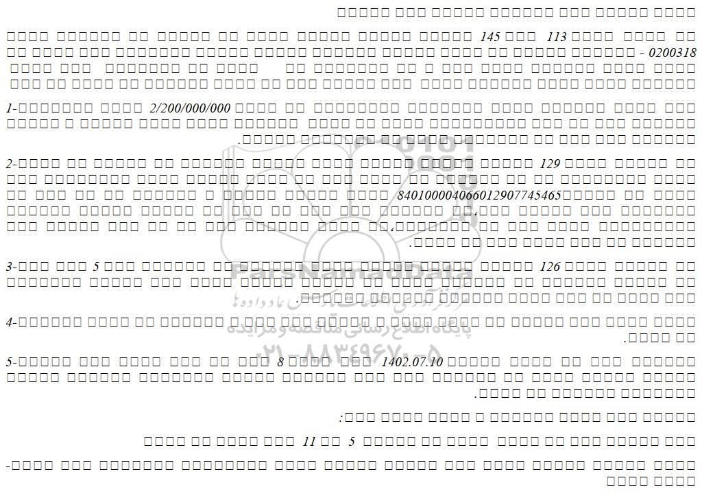 2-در اجرای ماده 129 قانون اجرای احکام مدنی برنده مزایده می بایست ده درصد قیمت پیشنهادی را فی المجلس یا همان روز به حساب سپرده موقت دادگستری خرم آباد به شماره840100004066012907745465 بانک مرکزی واریز و چنانچه به هر علت از پیشنهاد خود منصرف شود،یا حداکثر ظرف مدت یک ماه از تاریخ انجام مزایده باقیمانده قیمت ملک را نپردازد،ده درصد پرداخت شده پس از کسر هزینه های مزایده به نفع دولت ضبط می گردد.