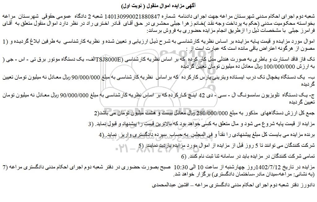 شعبه دوم اجرای احکام مدنی شهرستان مراغه جهت اجرای دادنامه شماره 140130990021880847 شعبه 2 دادگاه عمومی حقوقی شهرستان مراغه بخواسته محکومیت مدنی (حکم به پرداخت وجه نقد )خانم زهرا جبلی محشری در حق آقای قادر اختری راد در نظر دارد اموال منقول متعلق به آقای فرامرز جبلی با مشخصات ذیل را ازطریق انجام مزایده حضوری به فروش برساند: